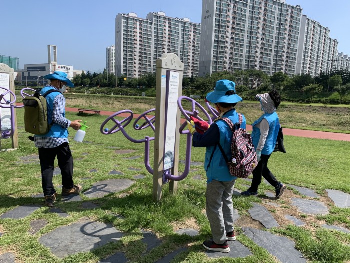 남천강살리기 참여자 어르신들은 코로나19 피해 예방을 위해 시민들의 휴식공간인 남천강변, 남매지, 사동근린 운동기구와 벤치를 7월부터 소독을 실시 하고 있습니다.
