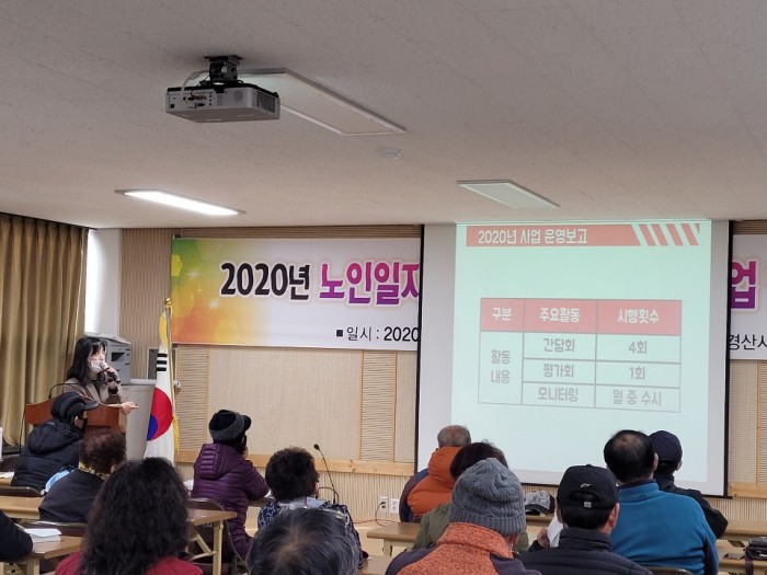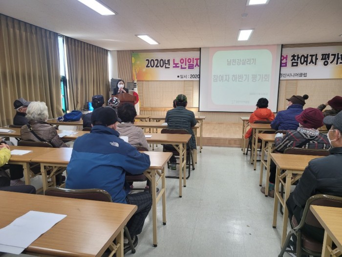 11월 17일 부터 12월 11일 까지 1년을 마무리 하는 2020년 노인사회활동 및 노인일자리 참여자 평가회가 1회당 50명 이하로 경산시니어클럽 3층 강당에서 이루어 졌습니다.