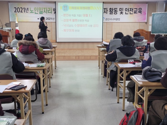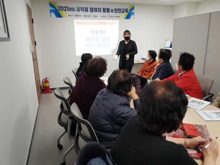 2021. 01. 25.(월)부터 2021. 02. 08.(월)까지 노인사회활동지원사업(공익형)활동교육 및 안전교육을 현장과 집합교육으로 진행하였습니다.