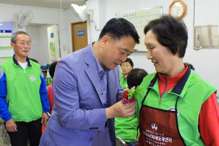 5월 7일 시장형사업단 어르신을 방문하여 카네이션을 달아드렸습니다. 건강하고 즐겁게 일하세요~