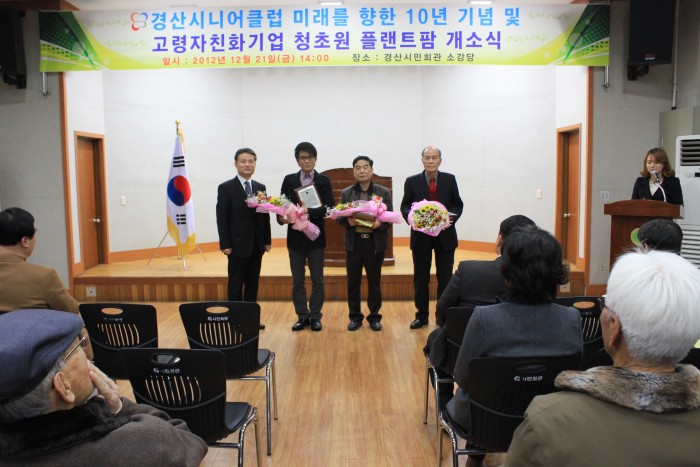 12월 21일(금) 14시 경산시민회관에서 「경산시니어클럽 미래를 향한 10년 기념 및 고령자친화기업 (주)청초원 개소식」이 있었습니다. 눈비 오는 궂은 날씨에도 참석하여 축하해 주신 여러분께 감사드립니다.