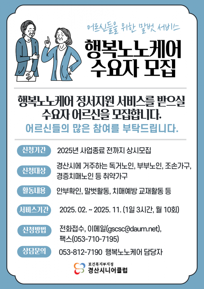 2. 서비스대상 : 경산시에 거주하는 독거노인, 부부노인, 조손가구, 경증치매노인 등 취약노인가구