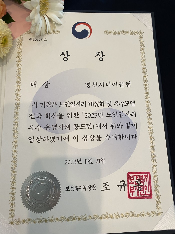경산시니어클럽이 2023년 노인일자리 우수 운영사례 및 신규 아이템 공모전 시상식에서 대상을 수상하였습니다!