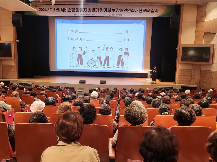 사회서비스형 사업단 상반기 평가회 및 장애인인식개선교육은 8개 사업단의 1,000여명의 어르신들을 대상으로 실시하였습니다! 경산시민회관에서 진행되었으며 많은 인원이었지만 모든 분들이 협조적이셨던 덕분에 평가회와 교육 모두 수월하게 진행될 수 있었습니다!