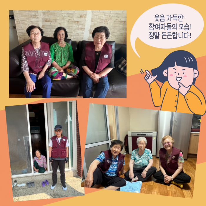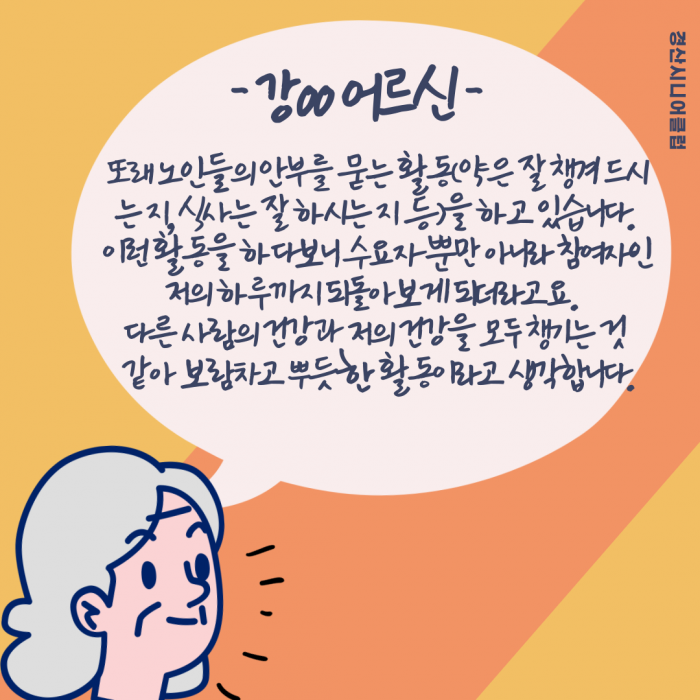 노-노케어란 노인이 노인을 돌본다는 뜻이며, 참여자 어르신들이 노-노케어 수요자를 방문하여 안부를 확인하고 건강상태를 점검하는 등 수요자 어르신들이 일상생활을 영위할 수 있도록 활동하고 있습니다.