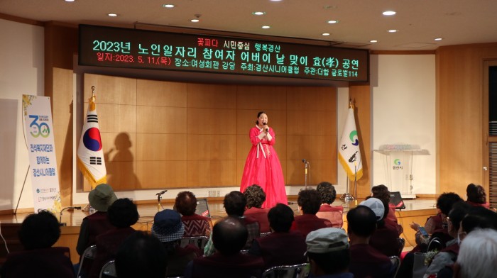 5월 11일(수)에 경산시 여성회관에서 일자리 참여자분들을 모시고 어버이날 행사를 진행했습니다! 경산시니어클럽 정진석 관장님의 인사말씀을 시작으로 하여 참여자분들께 카네이션을 직접 달아드리는 뜻깊은 시간을 가졌습니다. 마지막으로 행사에 참석해주신 분들을 위한 공연이 열렸습니다! 멋진 가곡과 민요 메들리, 국악 연주로 행사장을 풍성하게 채워넣으며 감동적이면서도 신명나는 순간을 모두가 즐길 수 있었습니다.