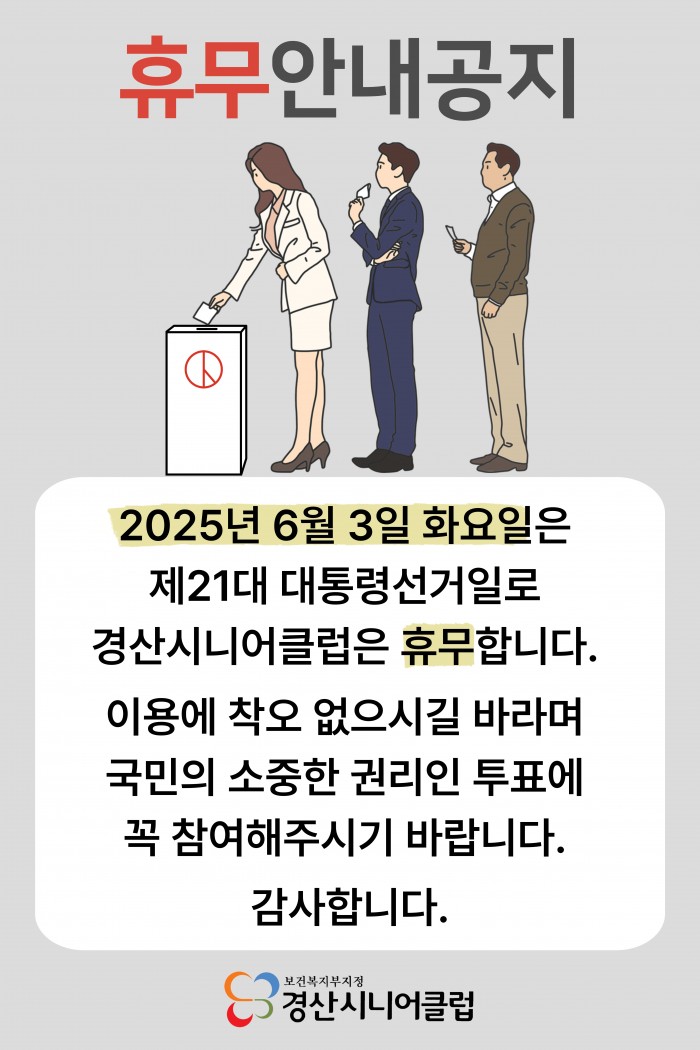 2025년 6월 3일(화)은 제21대 대통령선거일로, 경산시니어클럽은 하루 휴무합니다.
