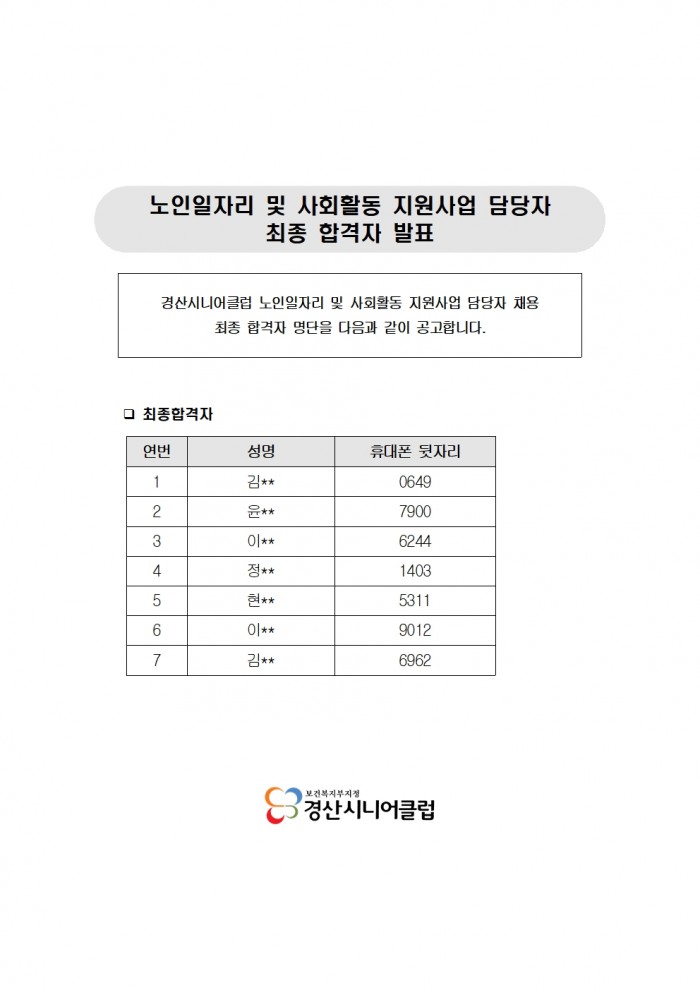 노인일자리 및 사회활동 지원사업 담당자  최종 합격자 발표