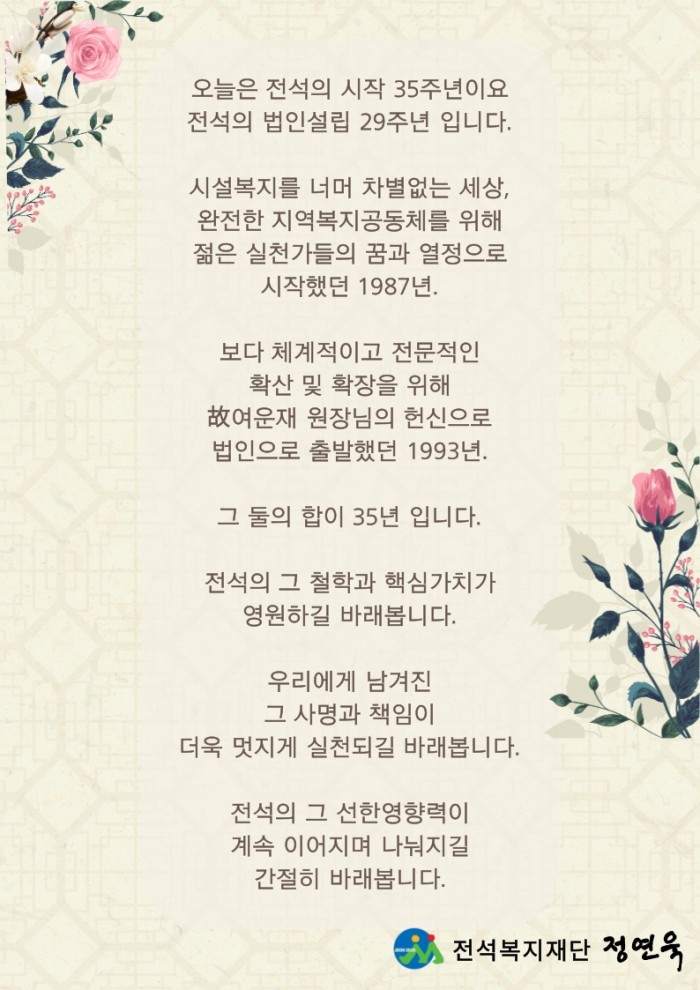 전석복지재단 설립 29주년 페이지 정보 작성자관리자 댓글0건 조회1,646회 작성일22.04.29 13:41 본문 1 이전글2022년 하계 사회복지 현장실습생 모집 22.05.19 다음글2021년도 결산보고서, 후원금수입 및 사용결과보고서 공고 22.03.31