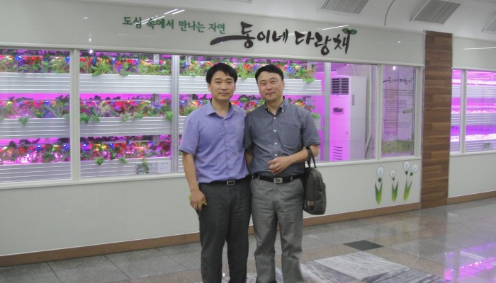 ↑↑ 지난 6월, 식물공장 기획을 위해 인천 동구에 위치한 식물재배 전시관 ‘동이네 다랑채’를 방문한 오명복(오른쪽) 관장.