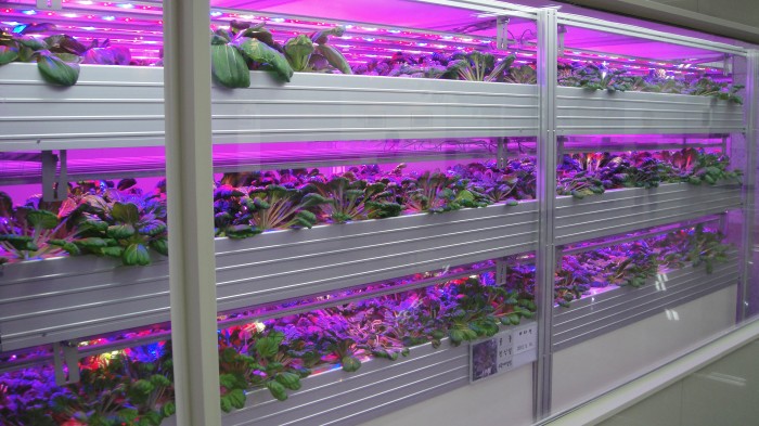 식물공장은 기후변화(계절, 집중호우, 초대형 태풍, 가뭄)에 관계없이 LED를 이용한 인공조명과 온도조절 및 이산화탄소 주입, 배양액을 통한 수경재배로 365일 무농약으로 채소 등을 생산할 수 있는 시스템적인 농업형태다. 컨테이너 형태의 건물에 책장 형태로 단을 나눠 채소를 재배하기 때문에 일반 농업과 달리 어르신들이 큰 힘을 들이지 않아도 재배가 가능해 고령자 친화기업으로 적합하다는 게 관계자의 설명이다.