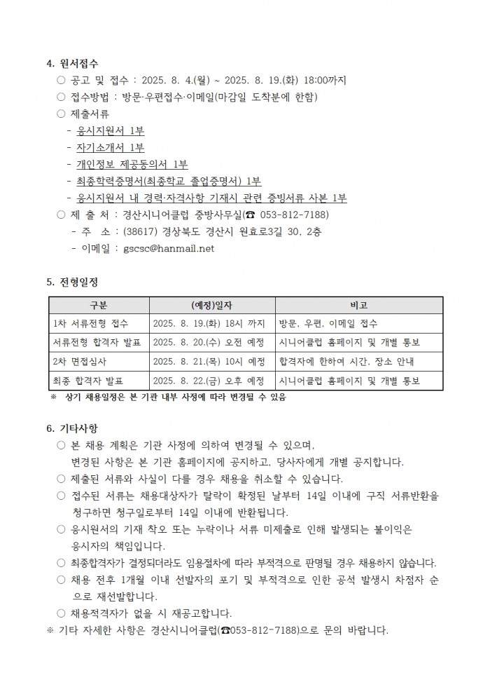 - 이전글경산시니어클럽 노인일자리 및 사회활동 지원사업 담당자 서류전형 합격자 발표 25.08.20