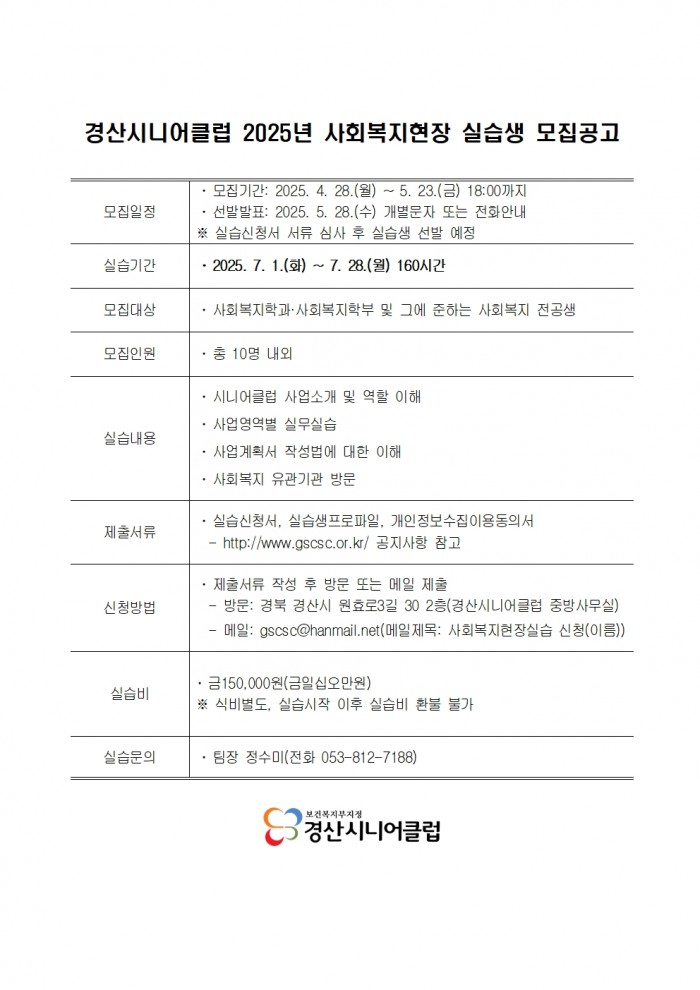 - 이전글2025년 경산시니어클럽 하계 사회복지 현장실습생 합격자 발표 25.05.28