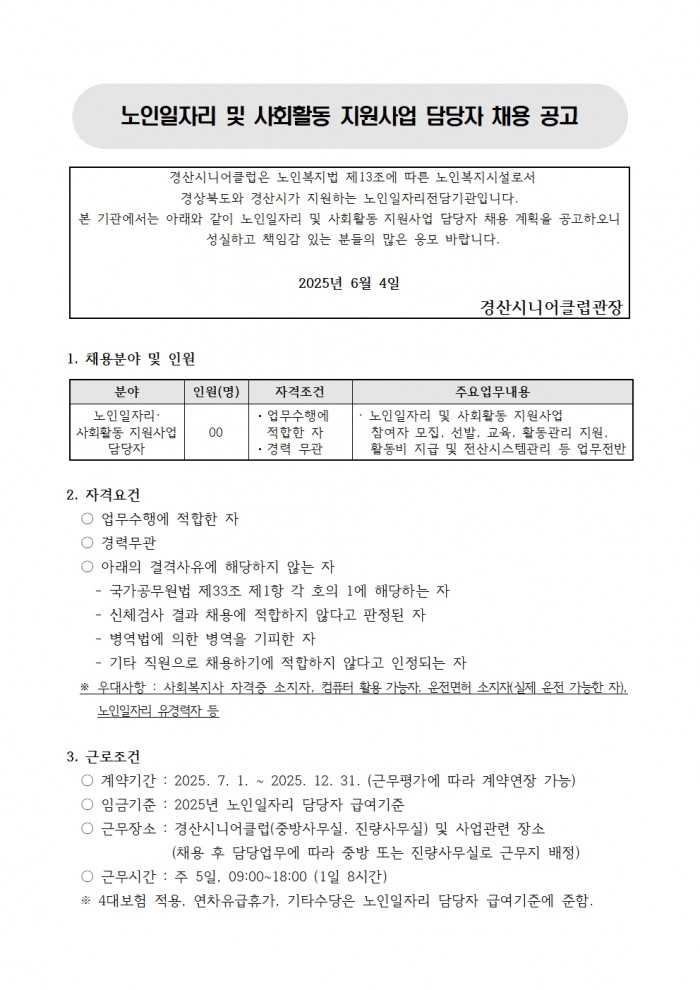2025년 노인일자리 및 사회활동 지원사업 담당자 채용 공고