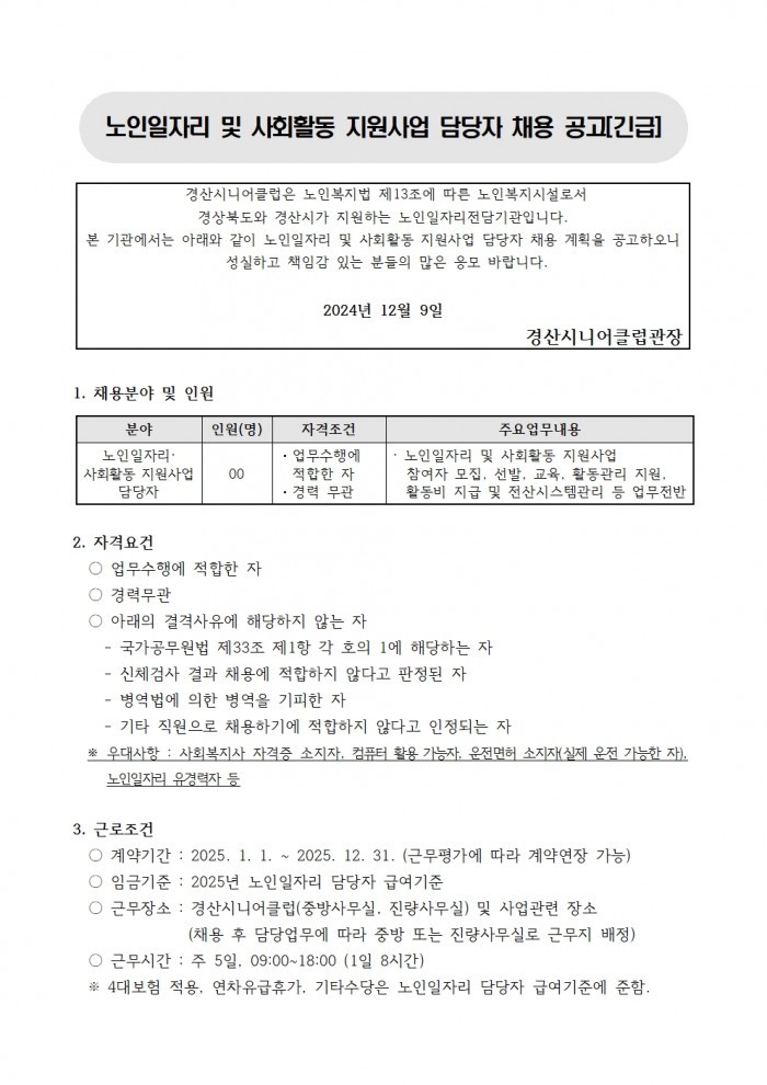 [긴급] 2025 노인일자리 및 사회활동 지원사업 담당자 채용 공고
