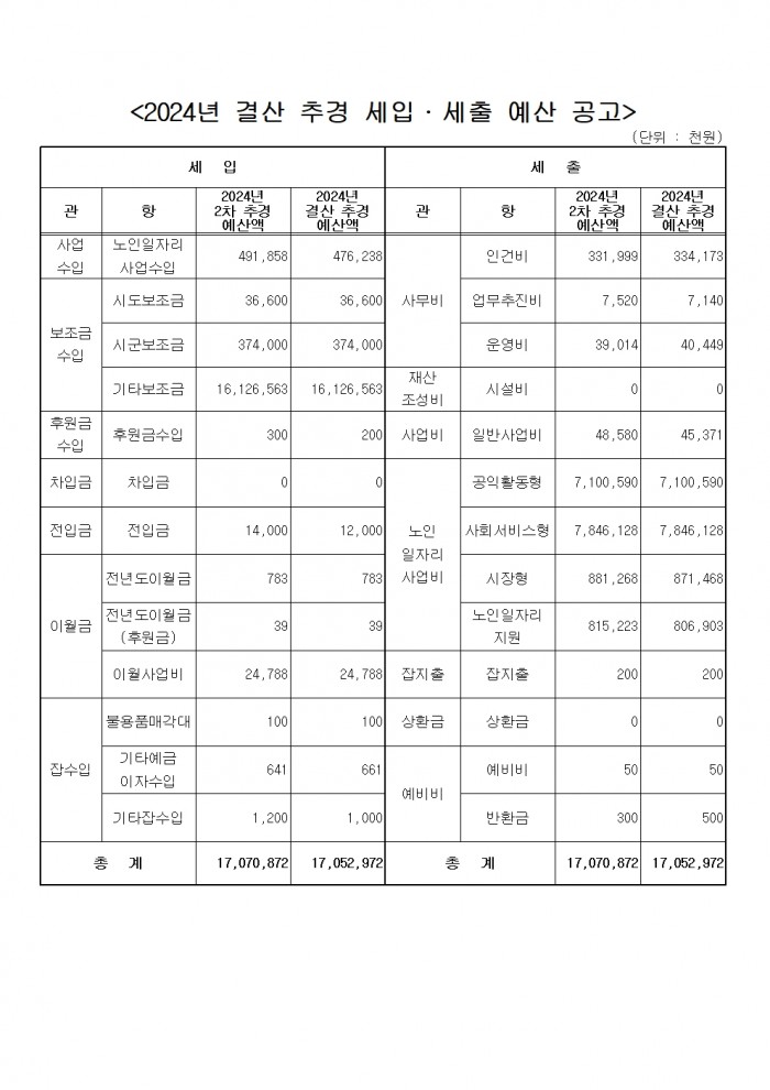 2024년 결산 추경 공고입니다.