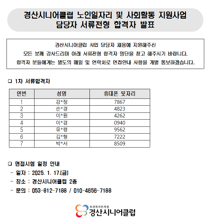 [긴급] 2025 노인일자리 및 사회활동 지원사업 담당자 서류 합격자 발표