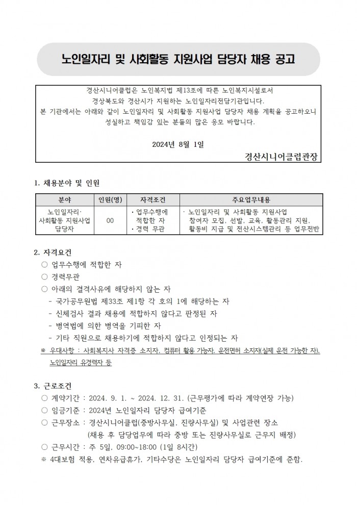 2024년 노인일자리 및 사회활동 지원사업 담당자 채용 공고