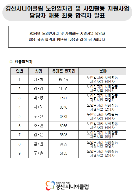 2025년 노인일자리 및 사회활동지원사업 담당자 최종 합격자 발표