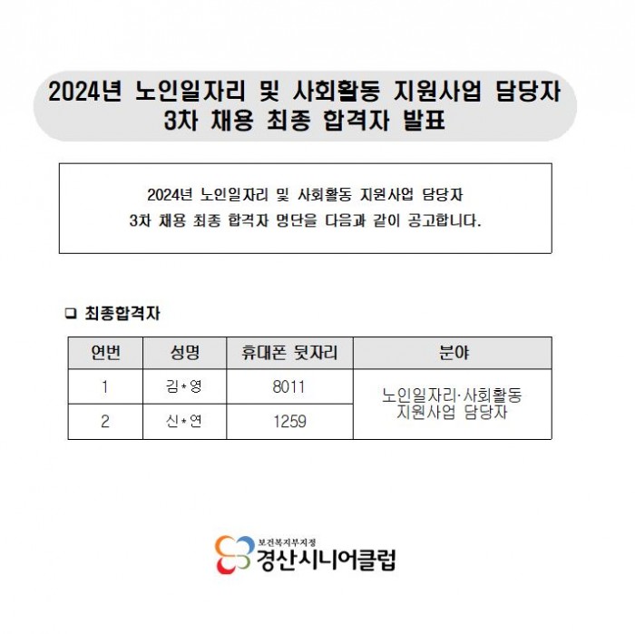 2024년 경산시니어클럽 노인일자리 및 사회활동 지원사업 담당자 채용 최종 합격자 발표