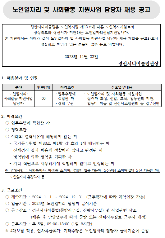 노인일자리 및 사회활동 지원사업 담당자 채용 공고