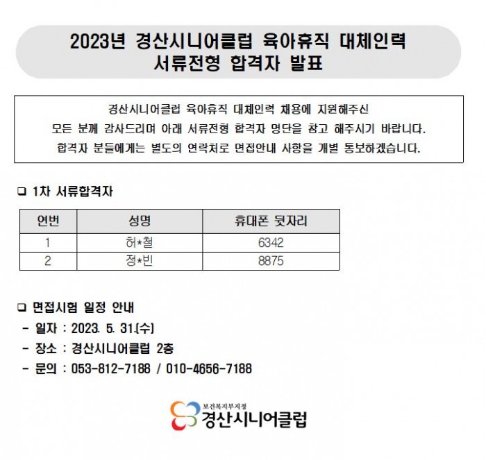 2023년 경산시니어클럽 육아휴직 대체인력 서류전형 합격자 발표