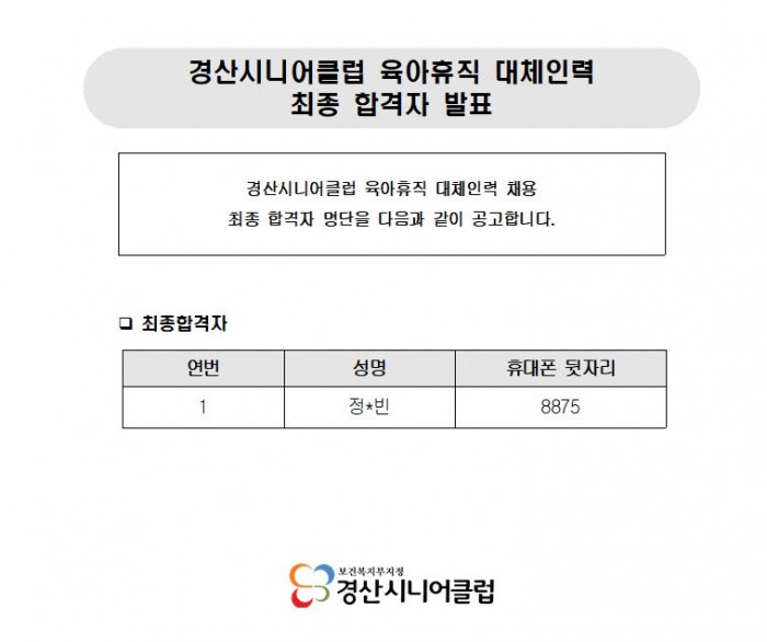2023년 경산시니어클럽 육아휴직 대체인력 최종 합격자 발표