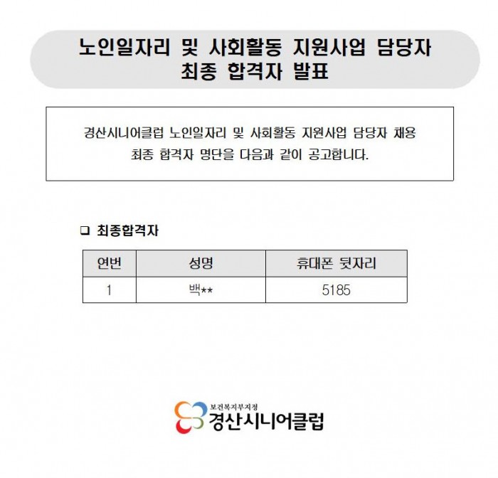 노인일자리 및 사회활동 지원사업 담당자 최종 합격자 발표