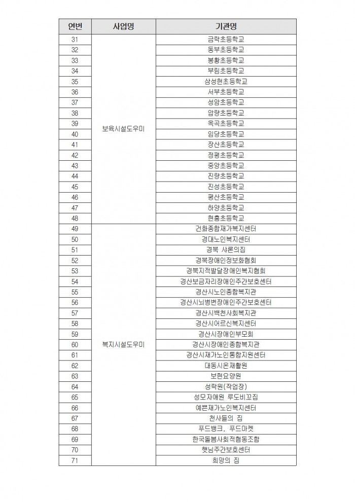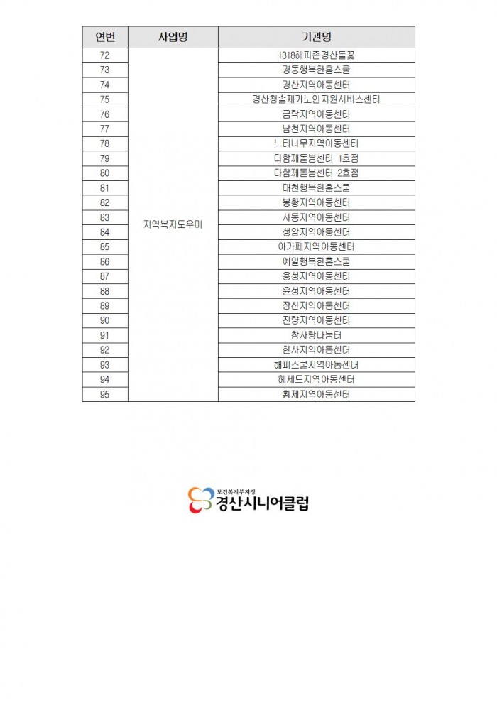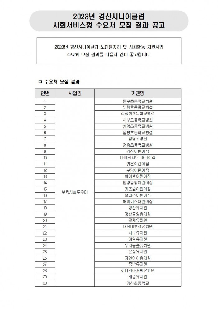 2023년 경산시니어클럽 사회서비스형 수요처 모집 결과 공고 페이지 정보 작성자관리자 댓글0건 조회1,386회 작성일22.11.15 14:17 본문 ㄱ 이전글노인일자리 및 사회활동 지원사업 담당자 채용 공고 22.11.28 다음글2021년 1차추경 예산공고 21.02.22