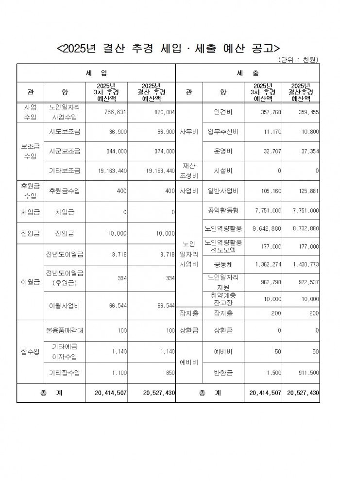 2025년 결산 추경 예산 공고 페이지 정보 작성자관리자 댓글0건 조회48회 작성일25.12.18 17:30 본문 2025년 결산 추경 예산 공고 이전글2026년도 세입·세출 예산 공고 26.01.02 다음글2025년 12월 업무추진비 집행내역 공개 26.01.02