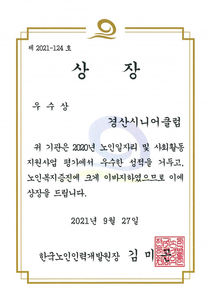 지난해 노인일자리사업 평가에서 우리 기관이 우수상을 수상하였습니다(훈격 : 한국노인인력개발원장). 시니어클럽, 노인회, 복지기관 등 전국적으로 1,300여개 정도 일자리 수행기관이 있는데 이중 180여개 기관(14%정도)이 공익형, 시장형, 인력파견형, 고령자친화기업, 일자리공모전 등 다양한 분야에서 이번에 수상을 하였으며, 이중 우리는 복수유형(공익+사회서비스+시장)부문에서 수상을 하게 되었습니다.