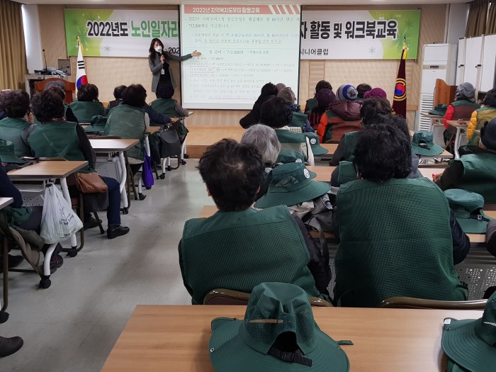 3. 내용 : 노인일자리 및 사회활동지원사업(사회서비스형) 참여자 집합교육 및 워크북 교육을 실시하였습니다. 코로나19와 관련하여 활동 교육 시 손소독, 체온 확인 등 방역 수칙을 잘 지키며 활동에 필요한 기본 교육 및 안전교육을 진행하였습니다.