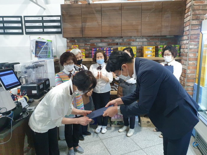 2020.06.24~25경산시니어클럽 카페 다시, 봄(cafe & market) 참여자 어르신 바리스타 양성을 위하여 커피고래와 교육 협약하여 5월25일 부터 진행된 교육을 수료하여 수료식을 진행 하였습니다.커피고래 사장님과 관장님이 참석하여 직접 수료증을 수여 하였습니다.