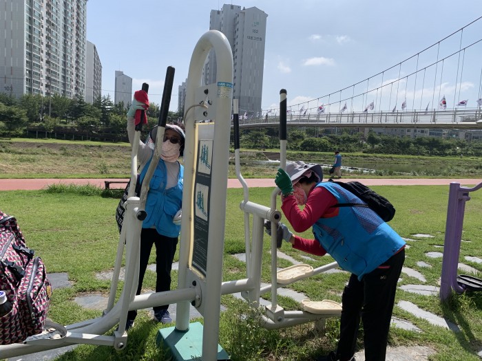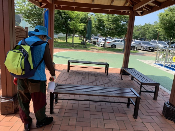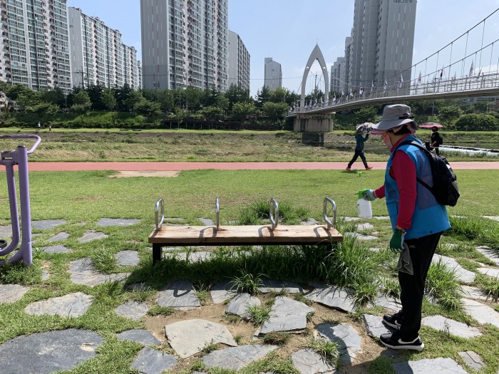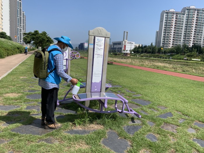 남천강살리기 참여자 어르신들은 코로나19 피해 예방을 위해 시민들의 휴식공간인 남천강변, 남매지, 사동근린 운동기구와 벤치를 7월부터 소독을 실시 하고 있습니다.