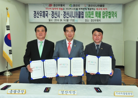 4월 14일 경산우체국 대강당에서 경산우체국·경산시니어클럽과 ‘노인일자리 아파트택배사업’ 업무협약식을 가졌다.