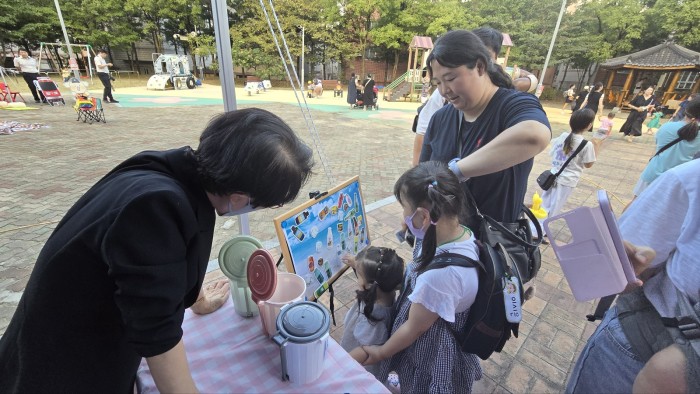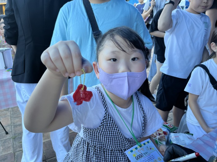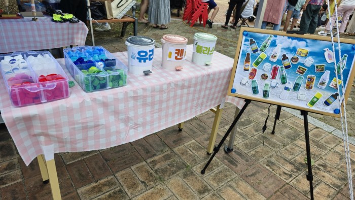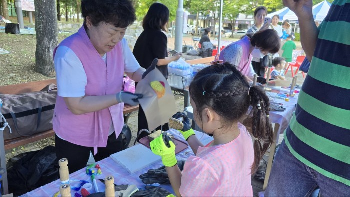 이 날 공연, 만들기체험, 먹거리, 쇼핑존 등 다양한 공간에서 부스가 설치 되어 장터가 운영되었는데요, 경산시니어클럽 새활용방앗간 참여자 어르신들이 폐병뚜껑을 활용한 키링 만들기 체험 부스에서 아이들과 함께 만들기 활동을 진행하였습니다!