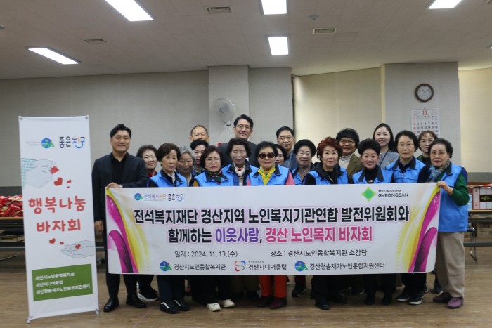 전석복지재단 경산지역 노인복지기관연합 발전위원회(경산시니어클럽, 경산시노인종합복지관, 경산청솔재가노인통합지원센터)는 11월 13일(수)에 경산시노인종합복지관 소강당에서 노인복지 바자회를 개최하였습니다~