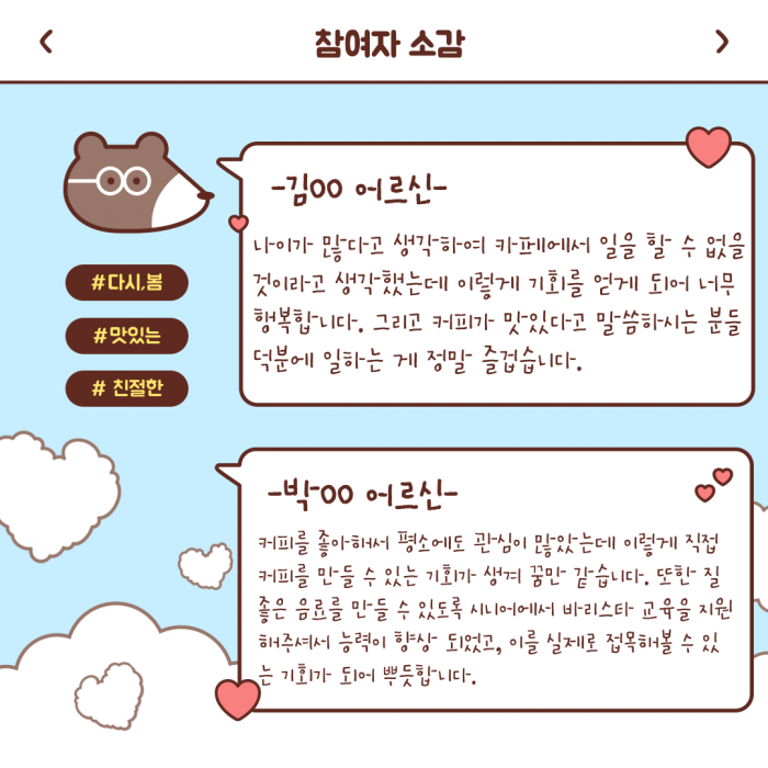 최근에는 스타벅스와 협업하여 시니어상생음료인 우리쑥곡물라떼를 판매하기도 하였으며 앞으로 다시,봄 2호점 개장이 예정되어 있는 등 활발하게 진행 중인 사업입니다.