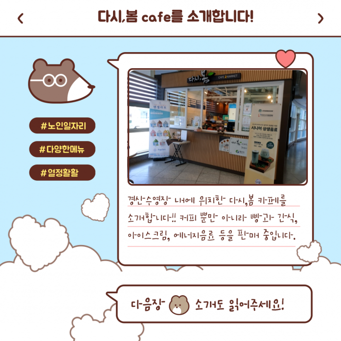 경산수영장 내에 위치한 다시,봄 카페는 어르신들이 직접! 만드신 음료를 판매하고 있습니다.