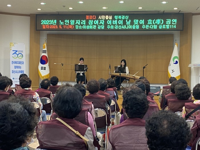 5월 11일(수)에 경산시 여성회관에서 일자리 참여자분들을 모시고 어버이날 행사를 진행했습니다! 경산시니어클럽 정진석 관장님의 인사말씀을 시작으로 하여 참여자분들께 카네이션을 직접 달아드리는 뜻깊은 시간을 가졌습니다. 마지막으로 행사에 참석해주신 분들을 위한 공연이 열렸습니다! 멋진 가곡과 민요 메들리, 국악 연주로 행사장을 풍성하게 채워넣으며 감동적이면서도 신명나는 순간을 모두가 즐길 수 있었습니다.