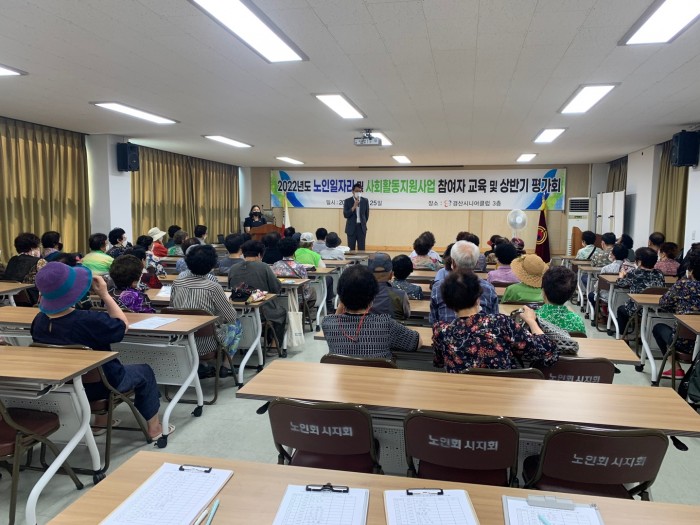 이번 상반기 평가회는 경산시니어클럽 정진석 관장님의 인사말씀을 시작으로 소양교육(100세 건강), 참여자 활동 교육, 상반기 평가회 순으로 진행을 하였고, 코로나19와 관련하여 교육 전 손소독 및 체온측정, 마스크착용 등 방역수칙을 준수하며 안전사고 없이 잘 마무리 되었습니다.