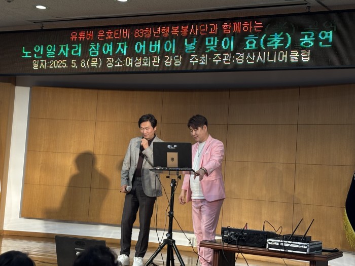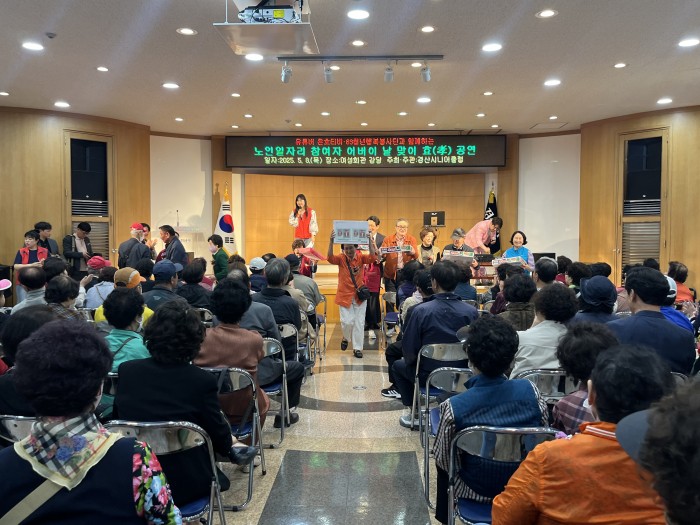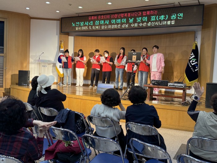 오늘 2025년 5월 8일(목), 여성회관 강당에서 어버이날을 맞아 특별한 행사를 진행하였습니다. 이번 행사는 '유튜버 은호TV, 83청년행복봉사단과 함께하는 노인일자리 참여자 어버이날 맞이 효 공연'이라는 이름으로 열렸으며, 노인일자리 참여 어르신들을 위한 따뜻한 축제의 장이 되었습니다.